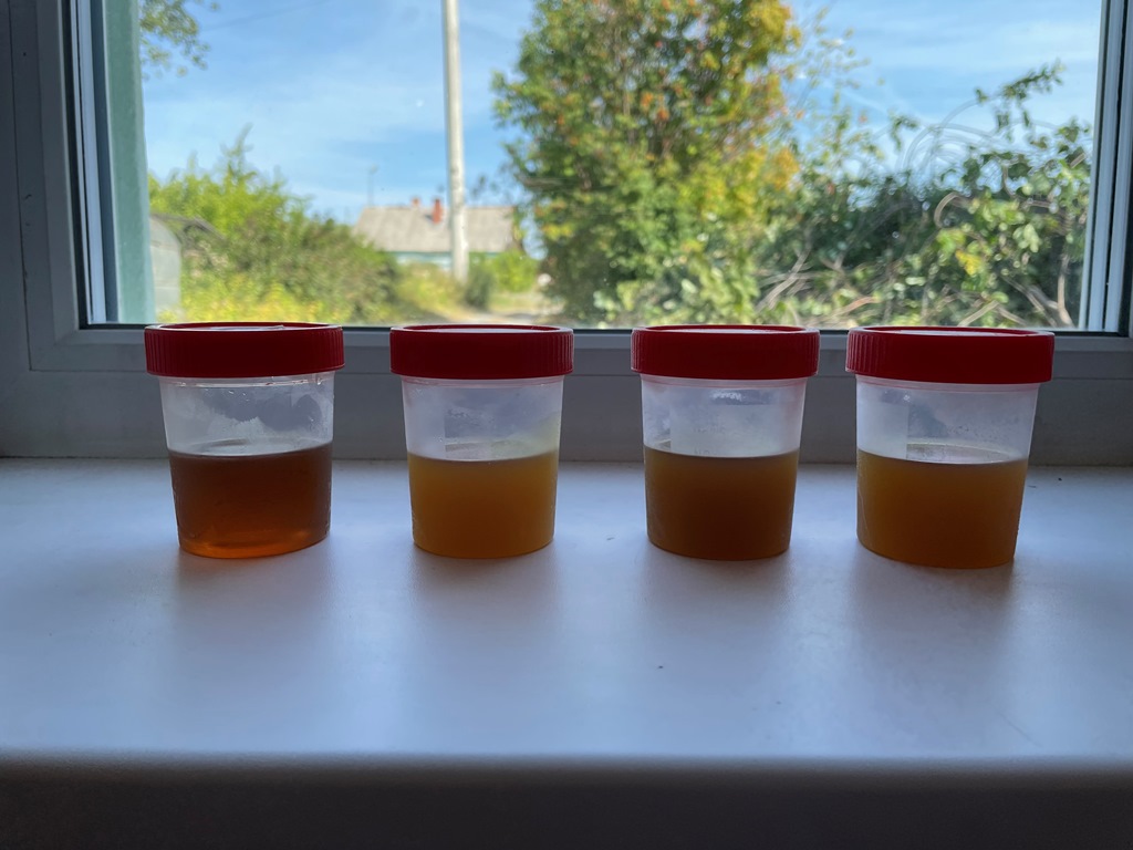 Фото для информации как выглядит паленый мобил после морозилки, стал светлее и мутный, текучесть намного хуже. Слева крайний образец - оригинал Мобила в котором не сомневаюсь, цвет остался прежний, прозрачный, такой же жидкий как и до заморозки.