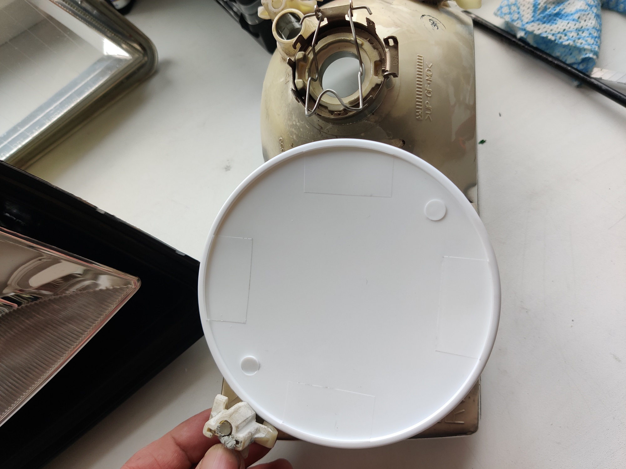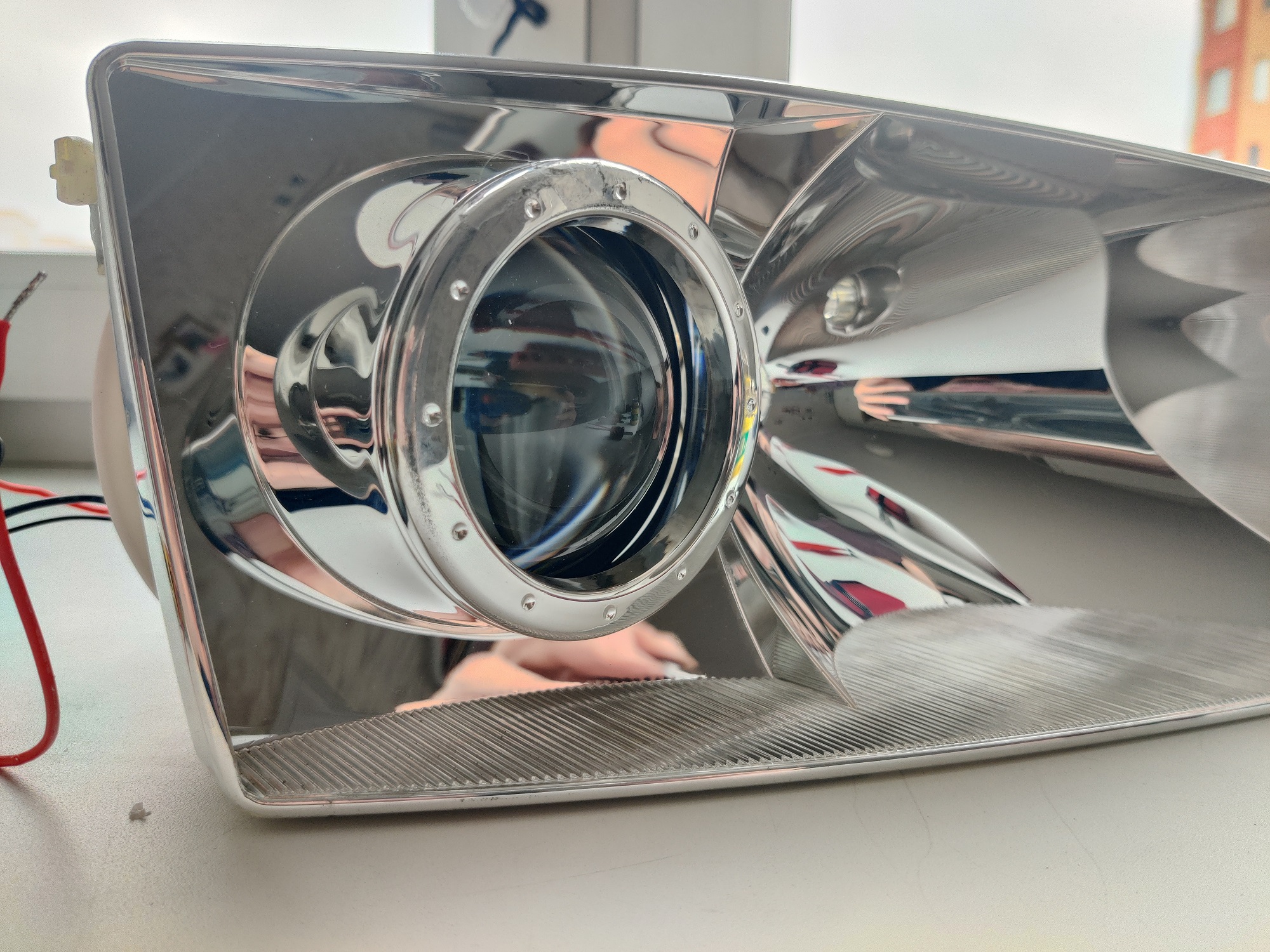 Ксеноновые фары разобраны, вытащен блок отражателя и примеряются купленные линзы.