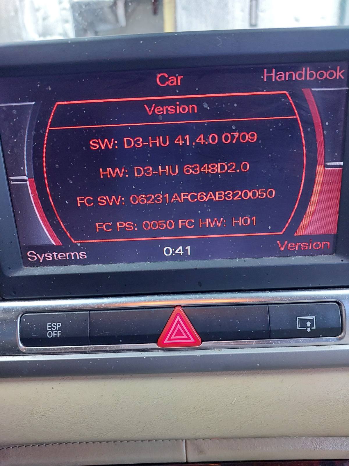 В целях проверки глюков блока MMI на разборке был приобретен другой и заменен, после замены блока проблемы с засыпанием машины ушли, но новый блок (с разборки) не имеет руссификации, а также на нем какая-то древняя версия: SW: D3-HU 07.7.0.0406