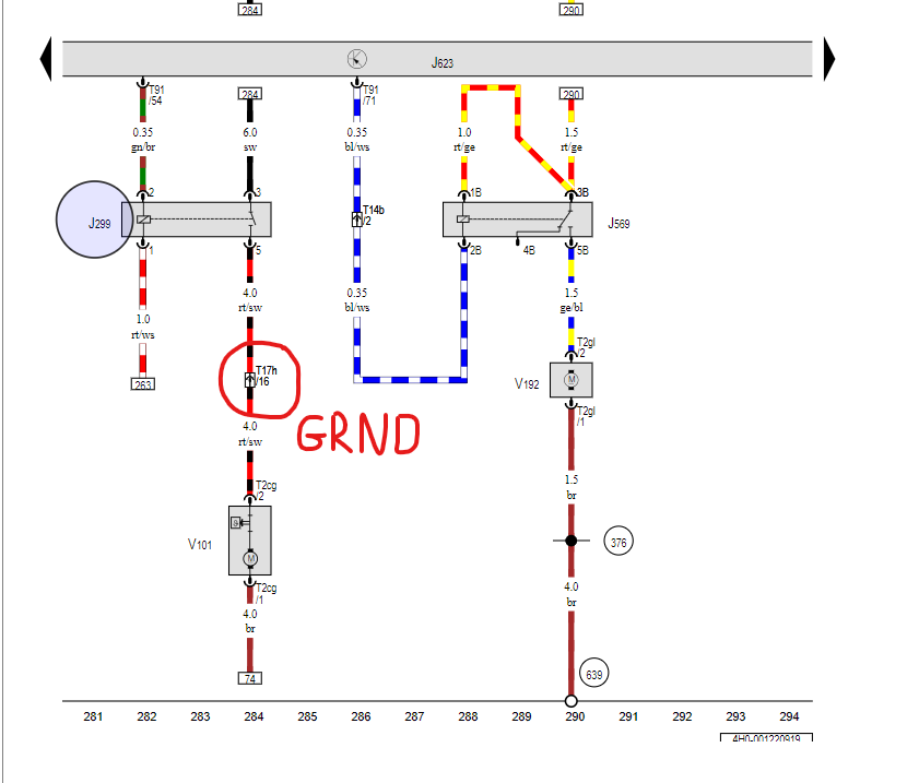 2. Обнаружил странную вещь - реле двигателя насоса вторичного воздуха J299 по идее включает тот самый двигатель (V101) подавая на него плюс с предохранителя "B" на 40A через разъём "5" (на схеме).