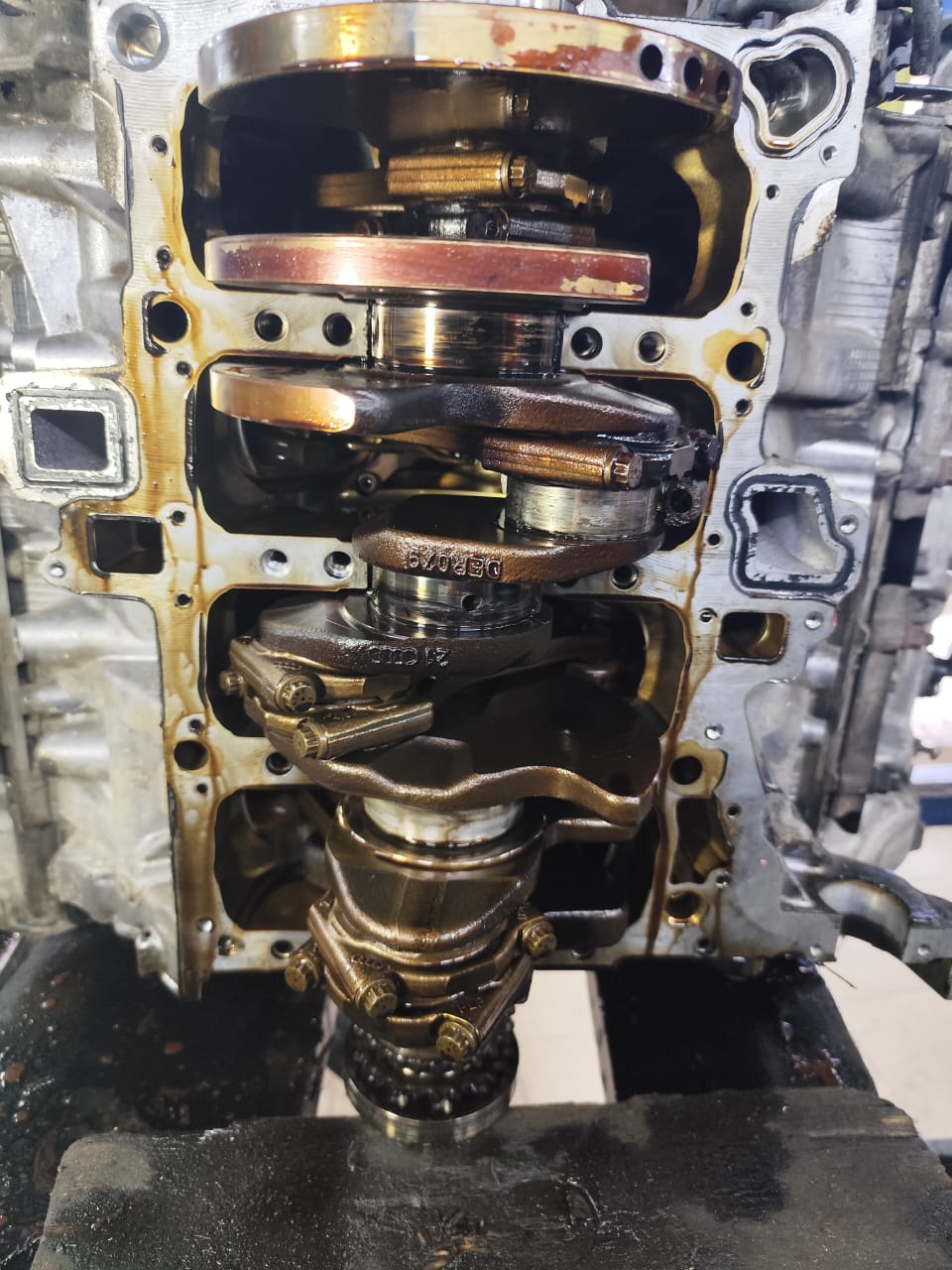 Внутри мотор чистый, однако несколько шеек почернели от перегрева. Сняли коленвал... Задранные вкладыши, трещинки в постели коленвала. Масляное голодание на лицо.