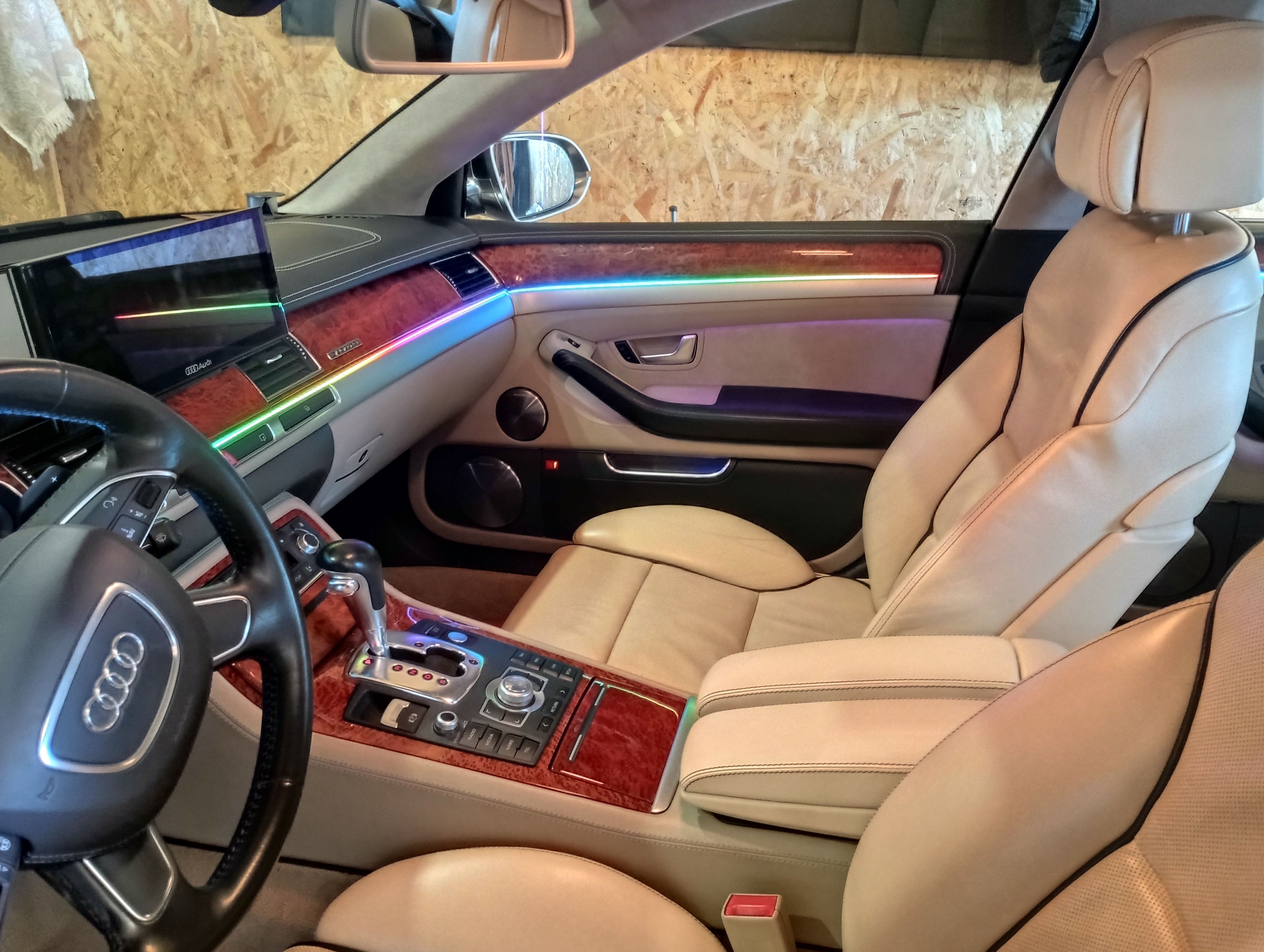 Всем категорический привет! Исследуя современные автомобили, обнаружил у них наличие контурной подсветки, которая не стояла в одном ряду с Ауди А8Д3,решил дооборудовать чем-то похожим. Сразу оговорюсь, фото вообще никак не передают реальных зрительных эффектов, а так- эффект просто бомбический.Делал долго, пришлось половинить все верхние вставки в двери (чтобы сделать щель). Но и тут ждала неудача - лента гнётся только в одну сторону, решил ставить её не поперёк, а вдоль.. Пришлось пилить дерево (жалко). Ну и в итоге..