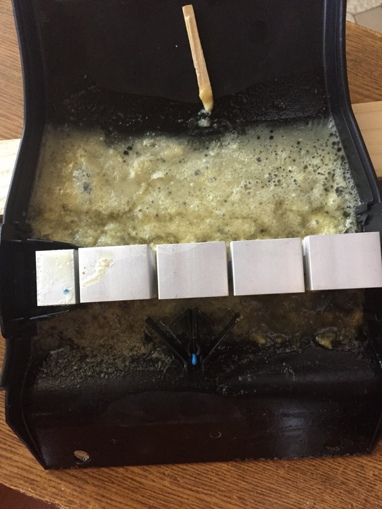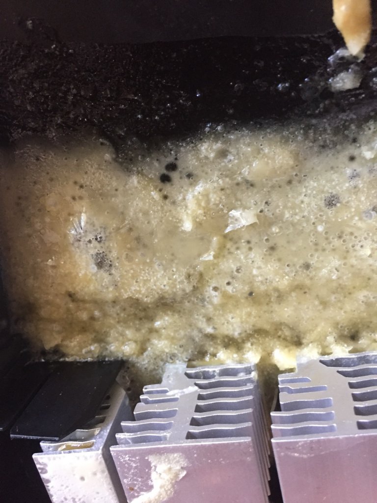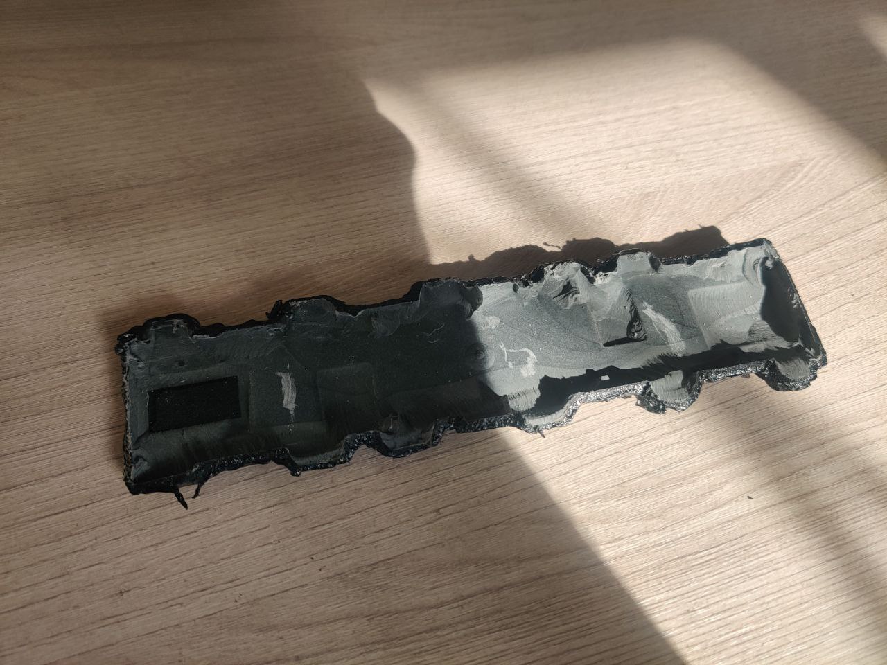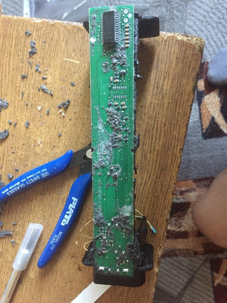 Прошу коллег поддержать мой проект. Была найдена смывка для компаунда в подогревателе для ног. Ниже привожу фотографии того, что получилось. На данном этапе эксперимента были утеряны некоторые элементы платы. Есть подозрения что они были утеряны при смывке..