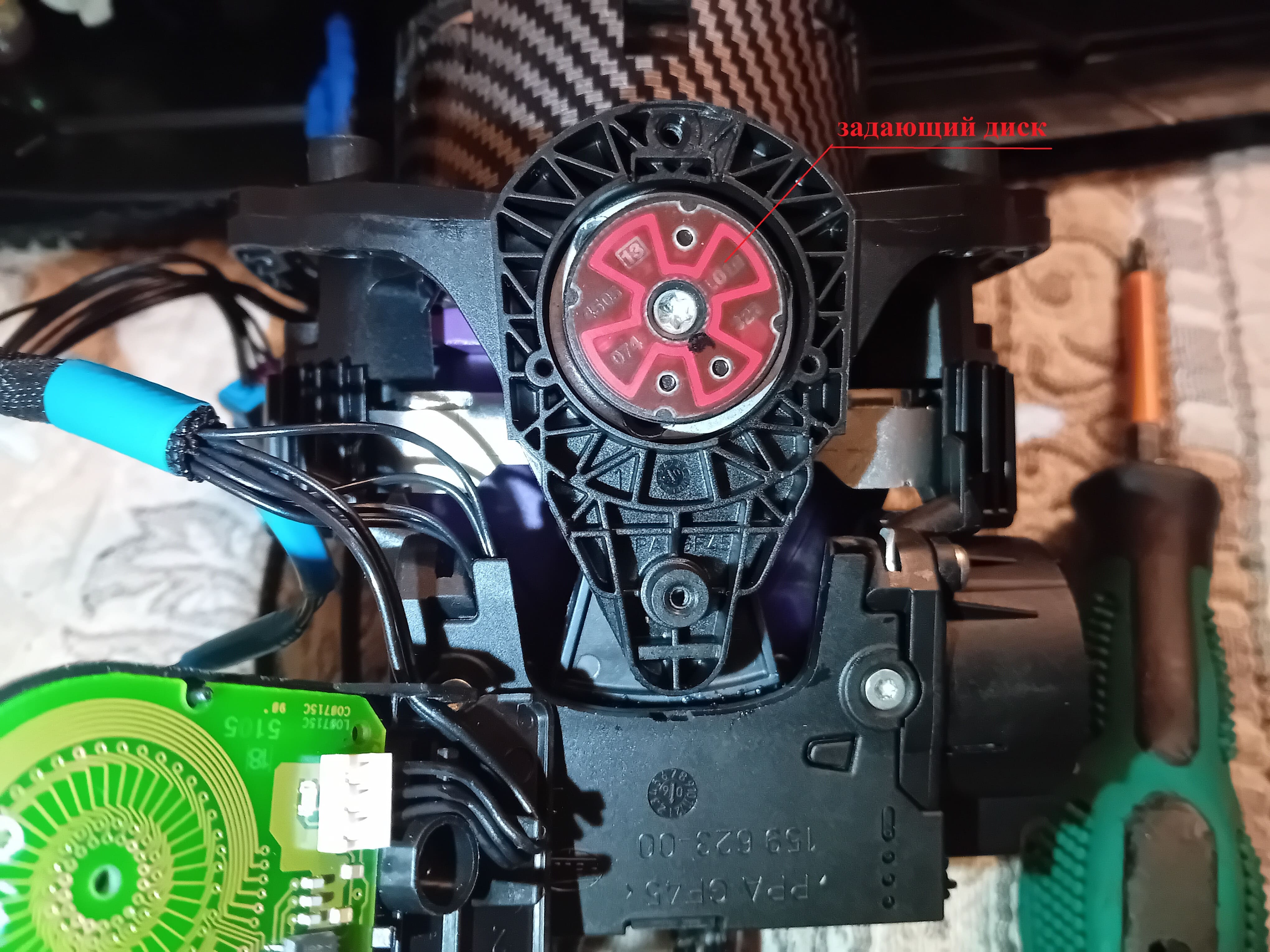 Здравствуйте, меняю ксенон на би-лед, сделал большую ошибку, не сфоткал положение задающего угол диска AFS системы (на фото пометил). После сборки при проверке на машине линза уехала в право, блок корректора фар думает что это нулевое положение. Может кто, знает как выставить этот диск ? Какое его правильное положение ?