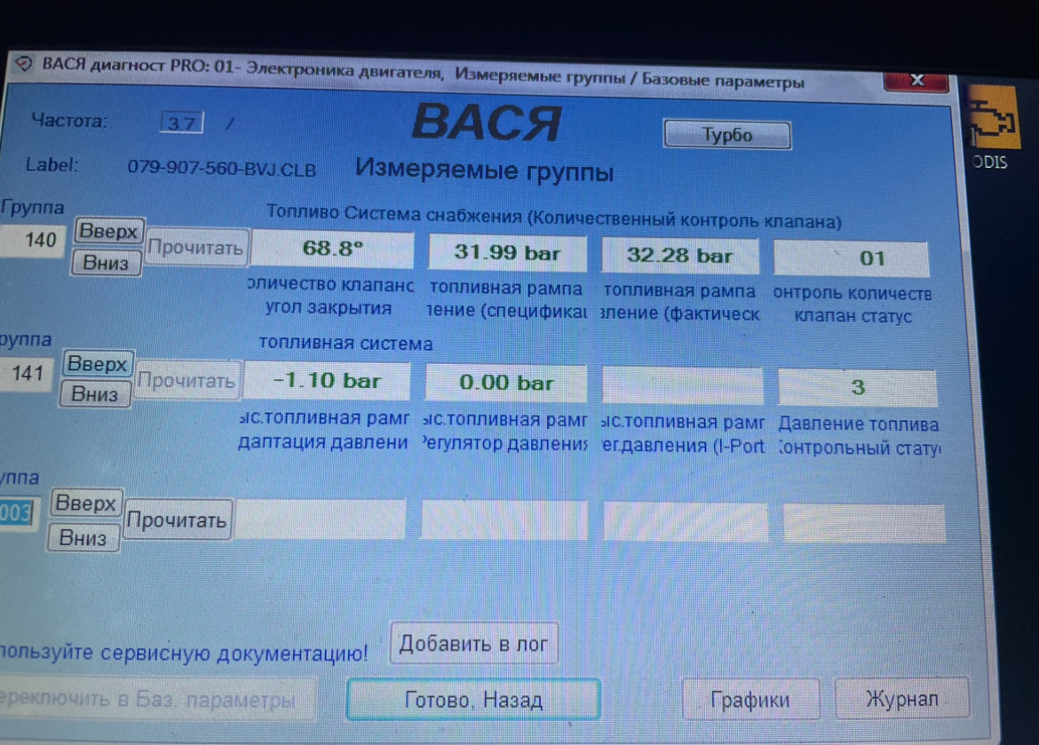 У меня ауди а8 д3 4.2FSİ 2008 плавают обороты и на холодную ,все менял (насос,форсунки,бобины свечи фильтера) наткнулся на диагностике что клапан регулятор давление завис на 0 (см фото) и нагрузка на насос 74%.