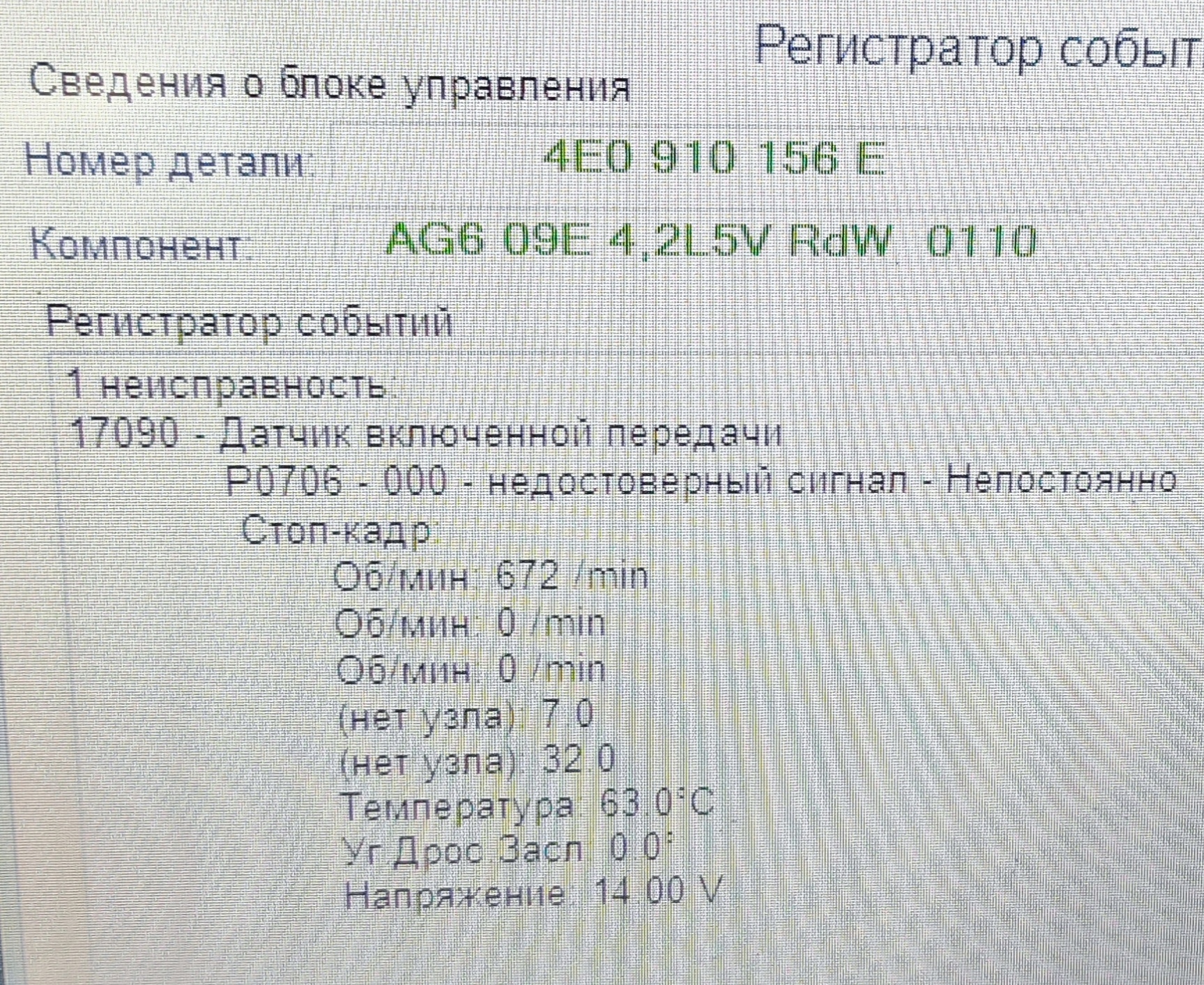 Началось все одним зимнем утром, на прогретой коробке, выезжая со двора на скорости 10км.ч. у меня выскочила данная ошибка. Коробка перешла в аварийный режим. Рабочие режимы это только P,R,N,3 передача на D. Более ничего не доступно. Включение очень жесткие, неприятные пинки при переводе из D в R. Всё это проявление аварийного режима, так как передача включается не с 1 а сразу на 3. После сброса ошибки все мгновенно нормализуется, до следующего включения аварийного режима. Что именно происходит? Датчик включенной передачи находится над поддоном с левой стороны коробки, метод его работы - магнитный. По моему мнению, когда уровень масла падает до уровня нахождения этого датчика, на поверхности масла может плавать разная кака, которая в виде намагниченной пыли собирается в области этого датчика, далее все это елозит туда сюда и нарушает магнитное поле, которое улавливает вторая часть датчика с электронной платой (куда заходят провода). Если смотреть VCDS, то можно увидеть что коробка улетает в аварию при переключении рычага АКПП, теряя значения в группе измерений. То есть она теряет положение селектора, так как магнитное поле прерывается грязью.