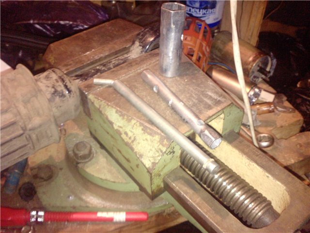 В связи с тем, что в моем наборе ключ трубка на 9 был меньше длины, чем трубка на 19, то я не мог удерживать трубку на 9. Поэтому я вынужден был отпилить часть ключа на 19 и вставить его обратно, что и видно на фотографии.