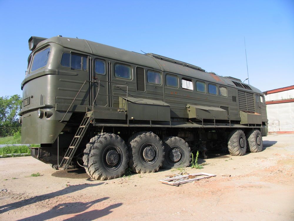 Верх этого чуда - бывший тепловоз ДМ62-1727 после ТР-3 в 2001 г., низ - шасси от пусковой ракетной установки на базе "Урагана" с увеличенной, по отношению к штатному варианту, шириной колеи. Привод колёс должен быть у каждого колеса индивидуальный (асинхронный электродвигатель, размещённый в ступице колеса и приводящий колесо во вращение через штатный планетарный редуктор). Для транспортировки приводом были оборудованы только 2 колеса, да и те не заработали. Привод поворота колес гидравлический с использованием каких-то непонятных исполнительных механизмов. В кузове установлена гидравлическая станция - именно из-за неё оно и не уехало. Ящики на боках - аккумуляторная батарея и ёмкость масла для гидравлики, ёмкости под рамой - топливные баки.В 2003 году на базе шасси МАЗ-547В в 21 НИИИ МО РФ был создан макетный образец шасси с электротрансмиссией и всеколесным рулевым управлением, предназначенный для эксперементальных исследований возможности и эффективности применения на тяжелых полно-приводных транспортных средствах высокой проходимости электротрансмиссии с различными алгоритмами САУ.