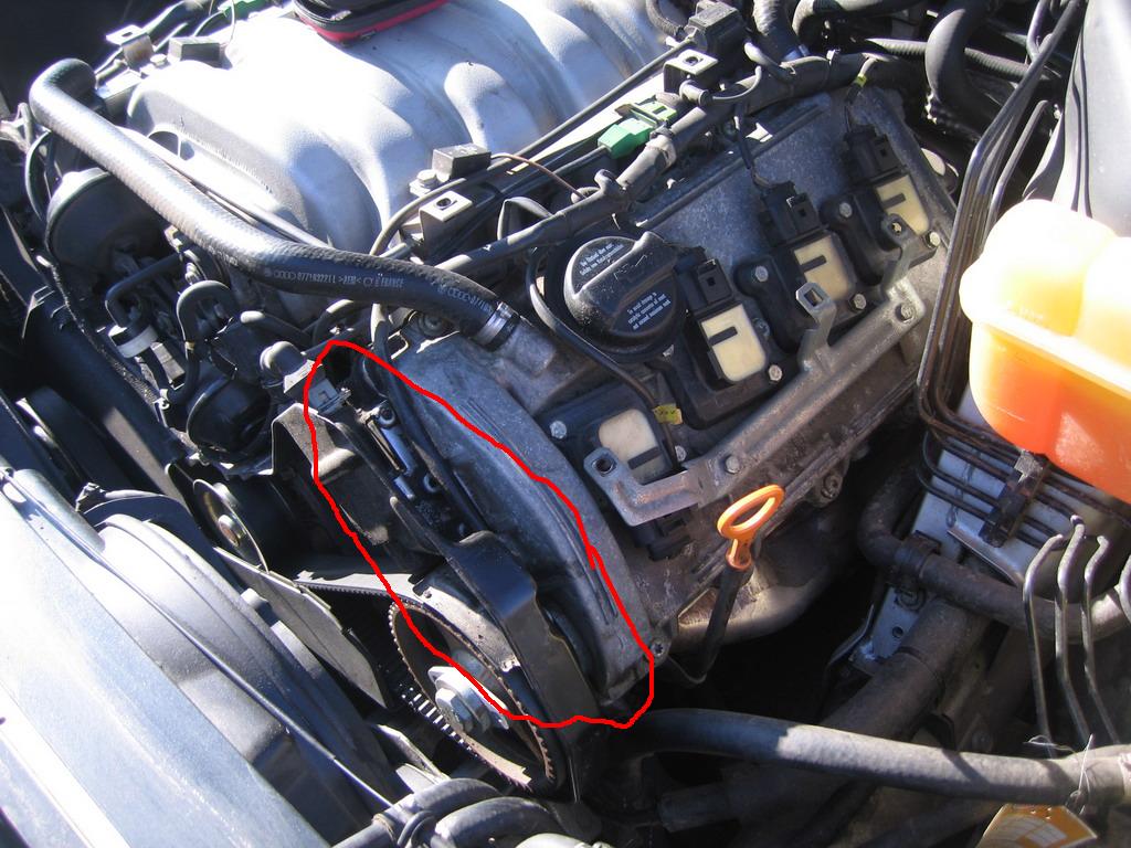 Сними и с другой стороны пластиковый кожух, посмотри. У меня немного сопливит из под натяжителей, 1-ый именно там где и у тебя, второй - по диагонали в районе под воздушным патрубком, обвёл красным на рисунке.