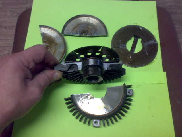 Итак муфта в сборе, в оригинале Behr, сверху биметаллическая пластина, при нагреве выгибается внутрь и давит на шток, шток в свою очередь на "ведомый" диск (принцип работы как у сцепления), сдвигая его внутрь ближе к "ведущему" диску. Пластина снята, виден шток в центре. Снята половина крышки, крышка завальцована и снять, не распилив, не получилось. Виден "ведомый" диск.