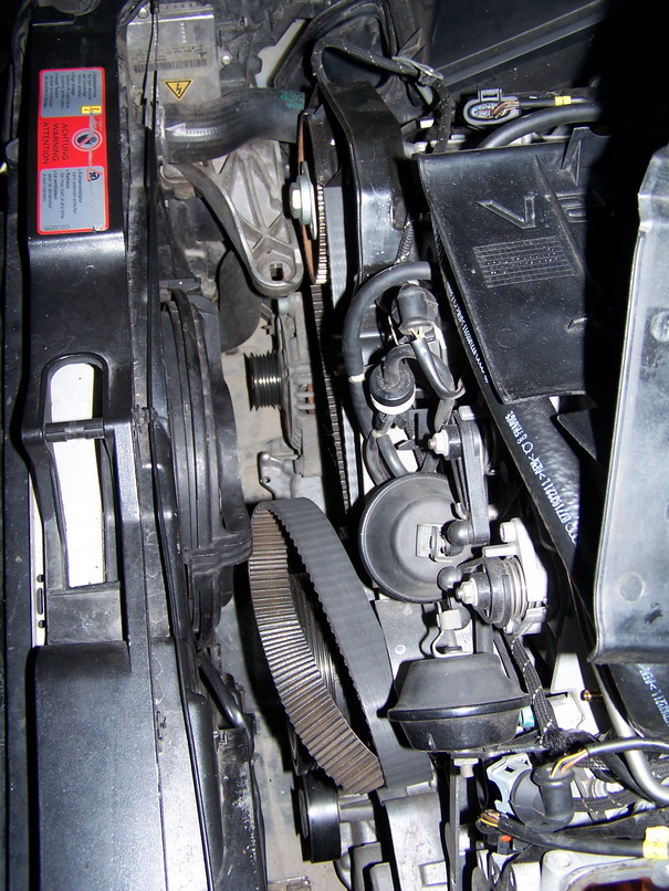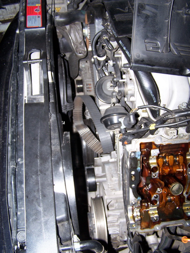 2. Установить по меткам ГРМ и скинуть ремень ГРМ (здесь подробно не буду описывать как установить и снять ремень ГРМ, так как готовлю отчет по замене ремня ГРМ). Могу только добавить, что эту процедуру можно произвести не разбирая всего передка, т.е. бамперов радиаторов и т.д. Это можно сделать сняв вентилятор с вискомуфтой, электровентилятор, скинуть ремень привода навесного оборудования, снять натяжитель ремня привода навесного оборудования, снять корпус с подшипником вискомуфты После этого будет доступ к ремню ГРМ.