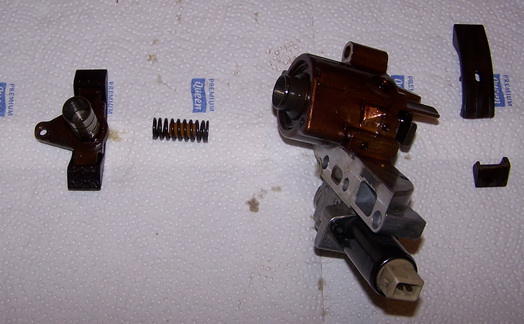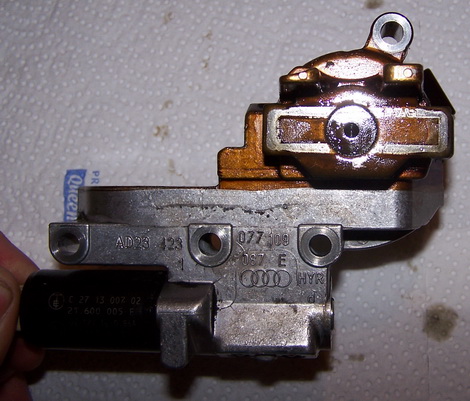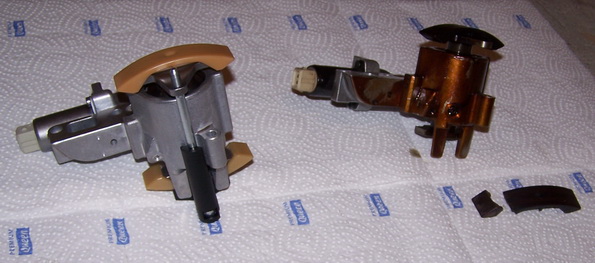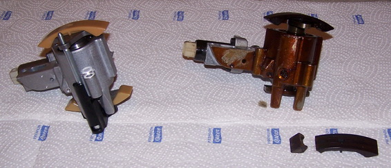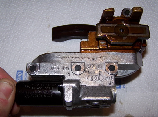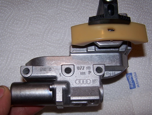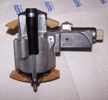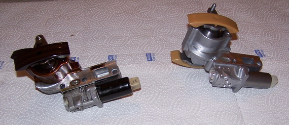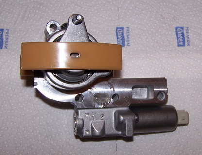 Так вот представляю вашему вниманию отчет по решению второй проблемы, т.е.по замене натяжителя цепи/регулятора фаз газораспределения. Оказалось, что этот натяжитель цепи/ регулятор фаз газораспределения заклинил (верхний поршень) и обломало кусок башмака, который, после снятия клапанной крышки, лежал себе на натяжителе. Слава богу, что этот кусочек башмака не попал где-то в другое место и ничего больше не повредил. Вобщем не известно, что вначале с ним произошло – заклинил и затем обломало башмак или наоборот. Одно только известно, что стук на холодную несколько секунд издавал скорее всего обломанный башмак, а ошибку выдавало из-за заклинившего натяжителя цепи/регулятора фаз газораспределения. Итак для замены натяжителя цепи/регулятора фаз газораспределения на левой головке, т.е. 5-8 цилиндр необходимо: