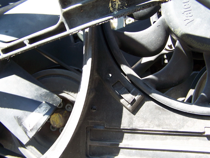 12. Удалить пластмассовый клипс и снять электровентилятор вместе с корпусом. Для демонтажа электровентилятора вместе с корпусом необходимо нажать пластмассовый лепесток на корпусе вверх и провернуть корпус по часовой стрелке, если стоять к нему лицом, т. е стоять спереди авто так, чтоб левая сторона авто была по правую руку, а правая сторона авто по левую руку. Отвести его в сторону.