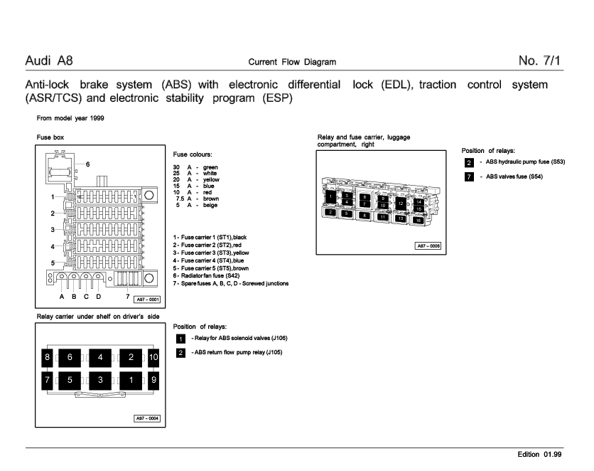 Найти проблем нет - но оно совсем не там, где казалось...ruslanA8 писал(а):помогите не могу на а8 найти реле АБС j-106. ваг-ком определил замыкание реле, оно находится под панелью приборов, но их там 4 штуки и все без обозначений