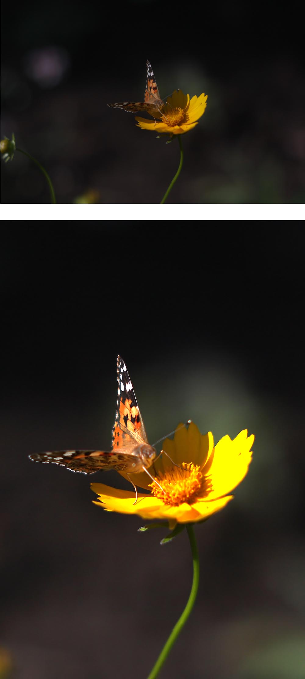 только смотри - верхний кадр это просто - я увидел и сфоткал, даже в газон залез, нижний кадр - немного подработанный - другой результат. а можно было просто газон щелкнуть с 5 метров широким углом -там внутри каке-то кусты обломанные, огрызки забора, окурки. цветок и бабочка, мол, додумайте остальное сами.