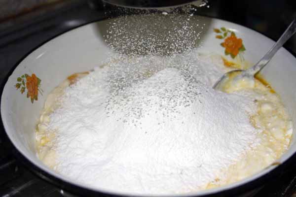 тесто (половина обьема) наливается в корытце , выкладывается начинка и заливается сверху остатком теста
