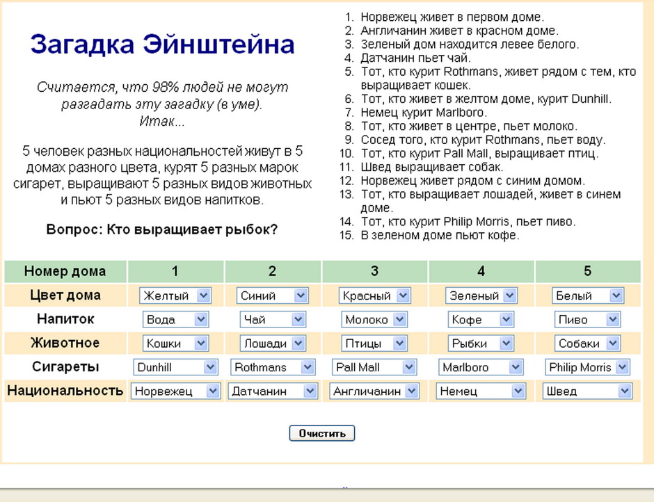 Разгадывал эту загадку в таком виде.... думаю, что в уме.. без бумажки или такой системы... будет гораздо труднее решить....Kotofay писал(а):filosof писал(а):есть у Эйнштейна загадка про дома.собаки цвета ..по его мнению,только 2% населения способны ее отгадать..кто знает текст в оригинале -выложите,хочется попробовать,а то только слышал о ней,а загадать никто не мог.http://www.baburyc.narod.ru/zagadka.htm