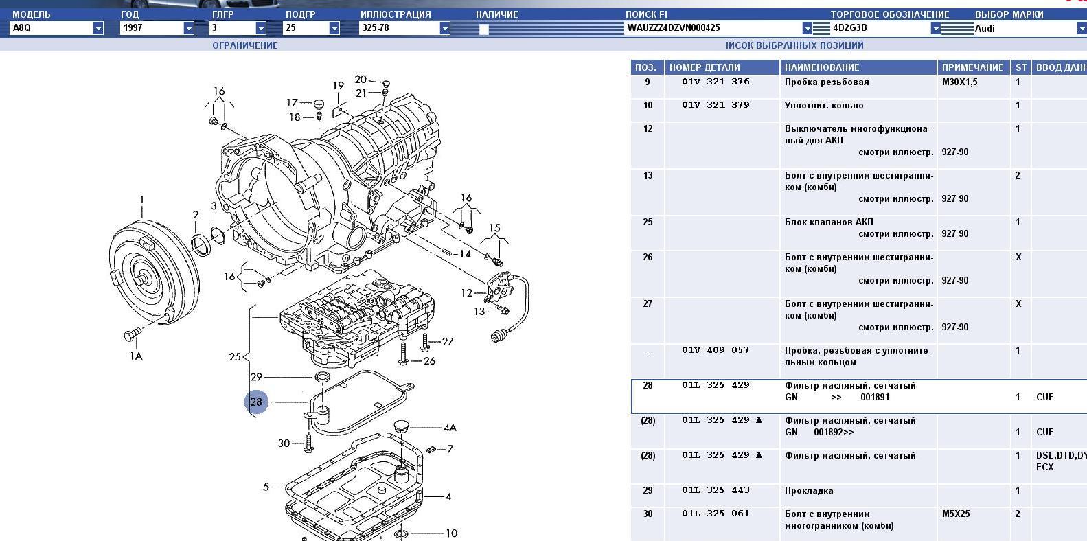 NOTE: 01L-325-429 is the filter part number for model year 1997 A8's that came with a type DPZ transmission with a serial number of 001891 or less.