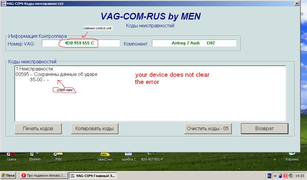 У меня не прокатило:(. Купил такой же девайс, блок srs с таким же номером 4d0 959 655 R. Через колодку не сработало, попробовал на столе, через ваг видит блок все нормуль, подключил девайс нажал d-clear, загорелась секунд через 20 зеленая лампа. Подключил обратно к ваг кому ошибка на месте. Раз 20 всяких вариантов перепробовал, один фиг. Наверное блоку совсем худо:). Самое интересное, после кнопки d-clear блок перестает видеться пока не выключишь и не подашь питание как будто зависает. Как бы терь понять блок менять или девайс китайцы криво собрали.