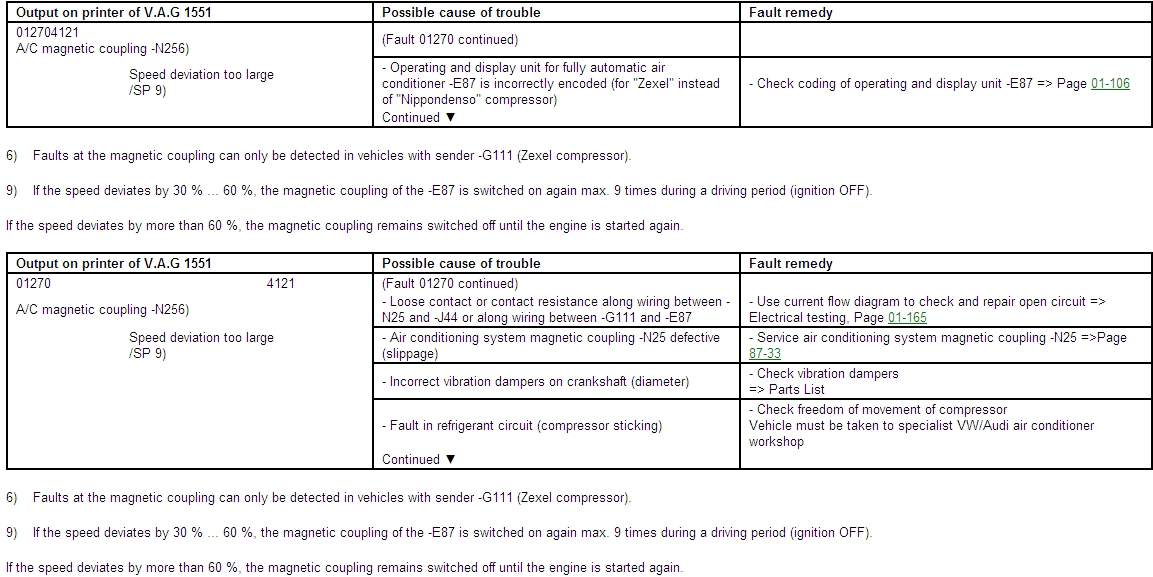 Доброе утро, проблема с кондиционером. Пользовался кондиционером всегда (и зимой и летом), проблем не было. При диагностике висела ошибка 01270 - обрыв. Но кондиционер всегда работал, ошибки по моторчикам заслонок, один я отключил - треск. 17/06/2010 на улице +35. Климат стоял на 22 AUTO дул воздухом на всю, но горячим и долго. (При поездках 1 час и более салон успевает охладиться). Вызвал заправщика - проверил фреон (долил 100 гр). Результат - муфта компрессора включается на 2 сек и выключается....