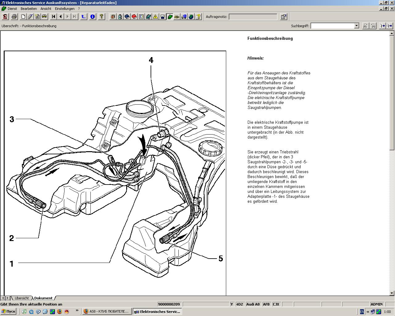 Здраствуйте . Я новичок на этом форуме ,но поскольку мотор не типичный для А8 , позвольте вмешаться...Внимательно прочитал всю ветку и скажу ,что John600 прав ,никакого давления в дизельном V6 на ТНВД не создается ,как правильно было замечено насос служит даже не столько для перекачки ,сколько для обязательного заполнения правого отсека бака откуда топливо подается на ТНВД,его главаная задача не дать попасть воздуху в магистраль ТНВД ,для той-же цели служит и датчик заполнения бака G210 (это отдельный датчик). Скорее всего, проблема именно в баке ,хотя не буду спорить если со стартера не заводится ,а с буксира заводится так диагностируется и ДПКВ)датчик колен-вала) ,но в данном случае ,заводка из канистры и ошибки по топливу все-же говорит о проблемах топливной системы . Обратный клапан не наблюдал ,но учитывая уровень топливного фильтра сомневаюсь, что он требуется .ИМХО конечно...Организация топлива в баке AFB вкладываю в файле...