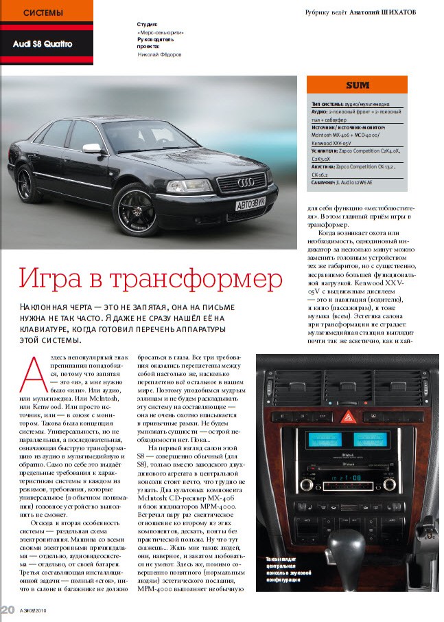 Очень прикольная инсталяция, ничего лишнего, все сделано с умом и фронты построены правильно. Я при планировании установки предних динамиков тоже рассматривал такую схему расположения динамиков, но желание сделать инсталяцию полностью под сток заставило пересмотреть концепцию расположения динамиков в сторону соблюдения целостности салона, хотя как в последствии оказалось-это самый тяжелый способ реализации фронтальной акустики на этом кузове(пришлось строить герметичные закрытые объемы на всю дверь с дополительным демпфированием панелей передних дверей)ALEX A8-98 писал(а):Ну вот как то так