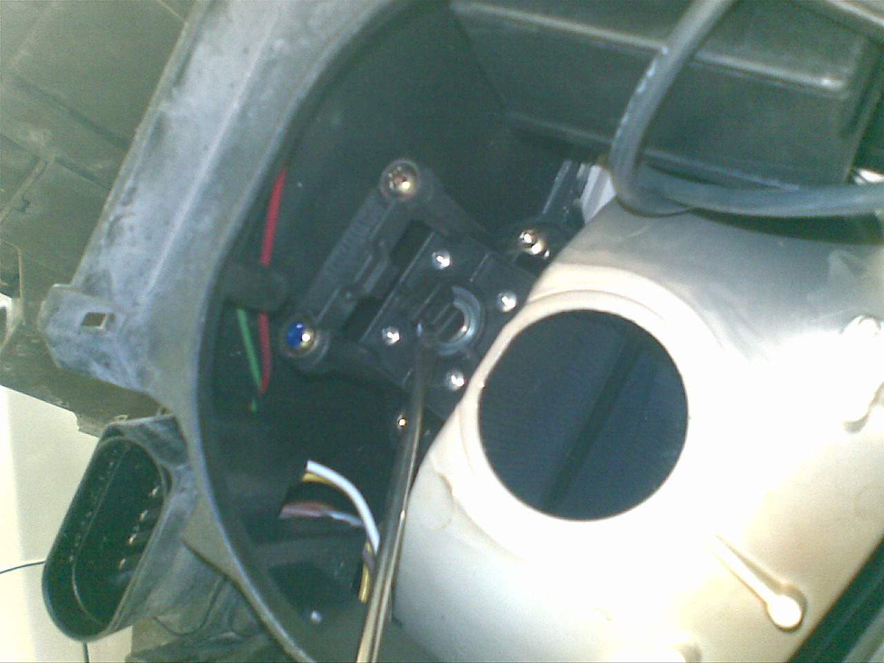 Это и есть механизм "биксенона" и автоматической (динамической) регулировки угла наклона фары. Этот механизм держится на четырех (прошу проещния если неправильно) торксонах (ну или попросту винтах с офигуренными головками). Это видно на фото. Открутив два винта сверху и ослабив два внизу, я вытащил этот механизм,при это аккуратно отсоединив его от управляющего механизма. Далее я вооружился ватой,спиртом и зажимом и смело взялся за процедуру очистки внутренностей.