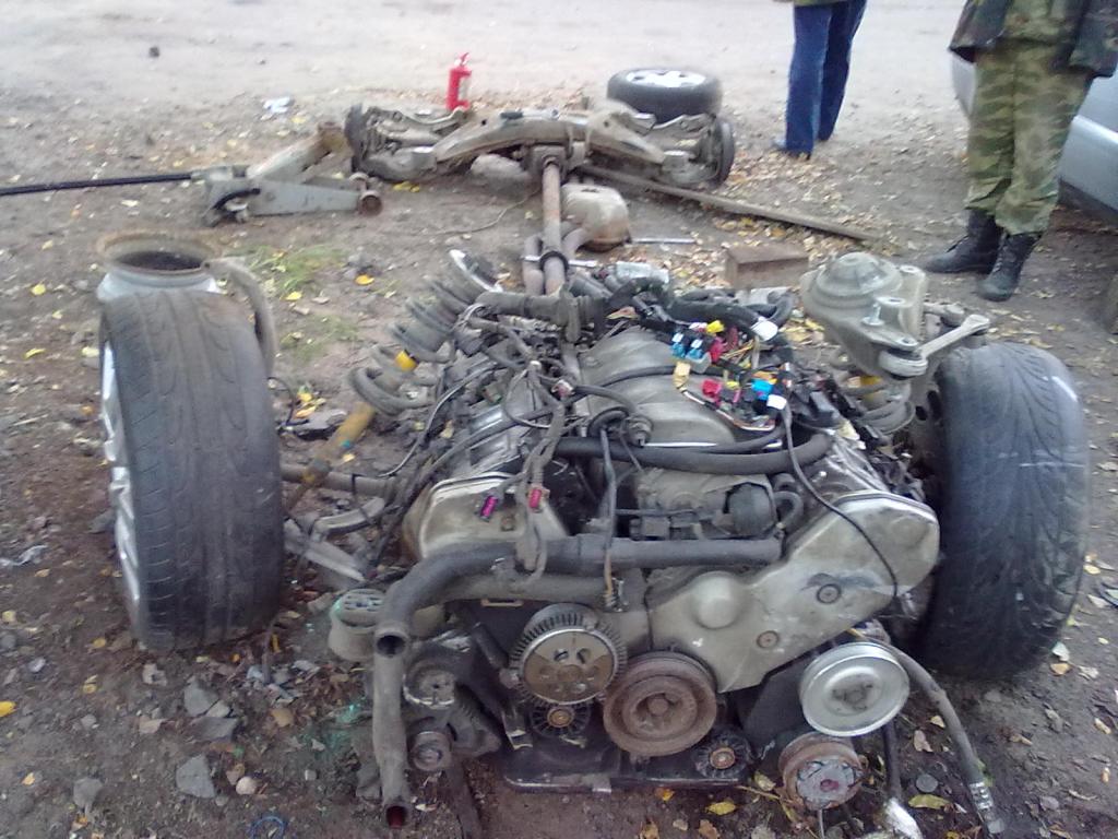 С начало открутили все трубки на моторе проводку,тормозные трубки,селектор акпп,глушитель,подвесной на кардане за тем 2 подрамника и краном подняли кузов в сторону.Потом уже коробку,кардан редуктор
