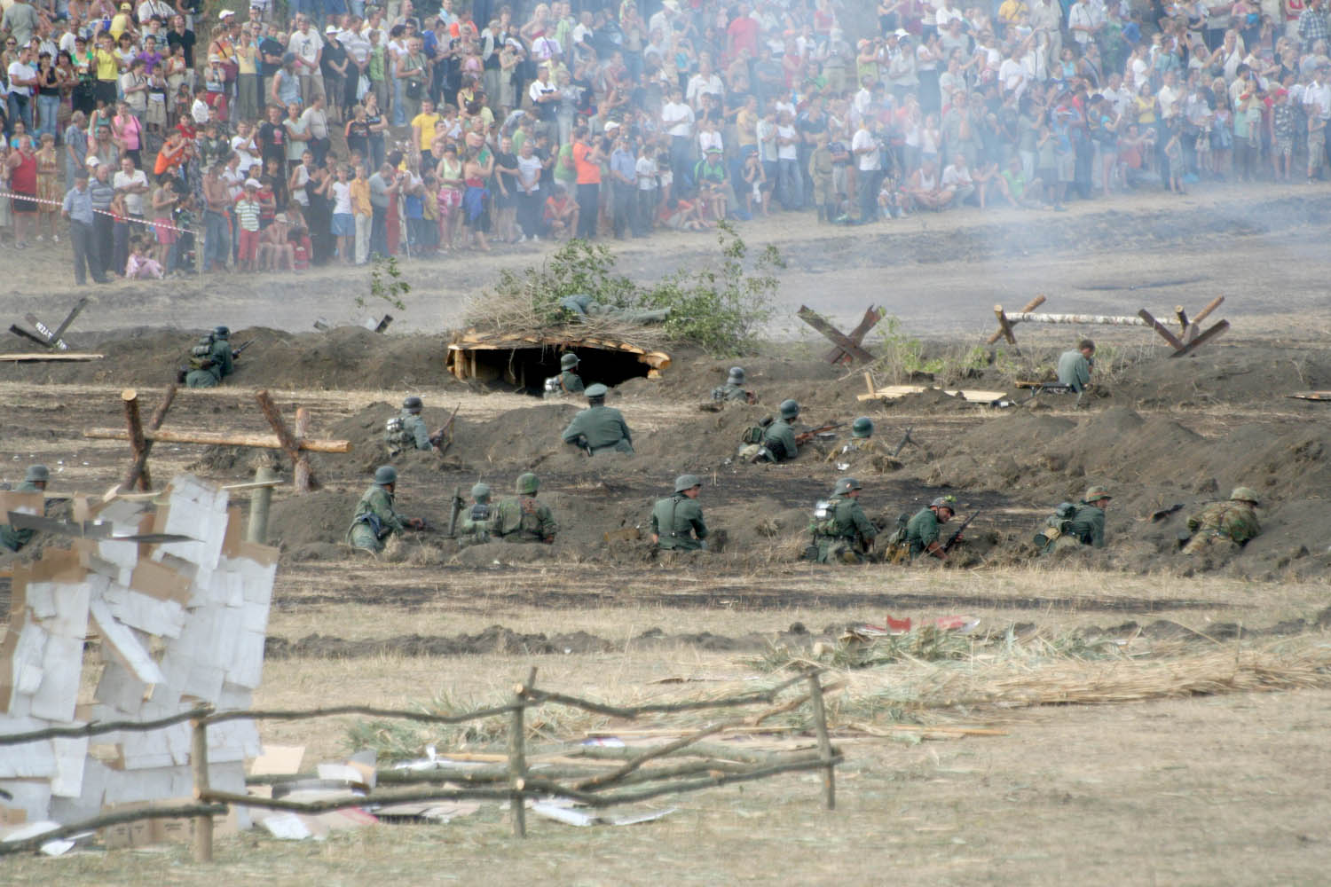 в честь годовщины освобождения родного города Таганрога была устроена реконструкция освободительной битвы, имевшей место в этих местах 65 лет назад - танки немецкие, самоходка русская, немецкие солдаты и красноармейцы, казаки на конях..ружья и пушки , автоматы, сабли и лопатки у казаков. Учебные самолеты со звездами демонстрировали превосходство над учебным самолетом с крестом, знать немецко-фашистским, был даже парашютист со со сбитого немецкого самолета.