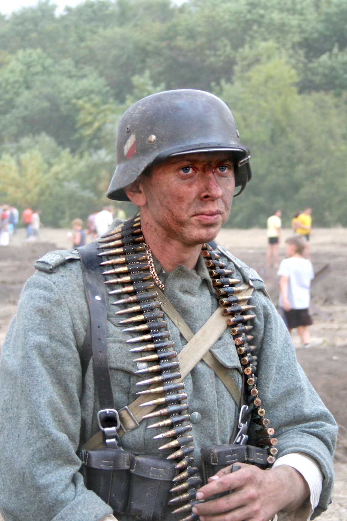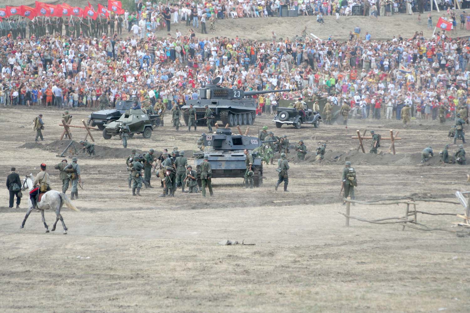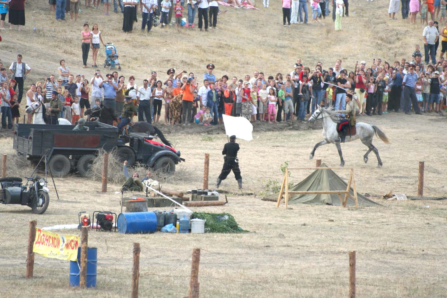 в честь годовщины освобождения родного города Таганрога была устроена реконструкция освободительной битвы, имевшей место в этих местах 65 лет назад - танки немецкие, самоходка русская, немецкие солдаты и красноармейцы, казаки на конях..ружья и пушки , автоматы, сабли и лопатки у казаков. Учебные самолеты со звездами демонстрировали превосходство над учебным самолетом с крестом, знать немецко-фашистским, был даже парашютист со со сбитого немецкого самолета.
