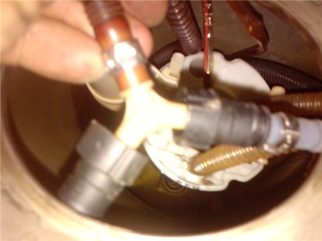 Находим два тройничка топливной системы в баке. Они отличаются тем, что один просто пластиковый (вот он) А второй с короткими шлангами-переходниками, на которых установлены коннекторы с защелками. От обоих тройничков отсоединяем по два шланга, нажав пальчиками на защелки.