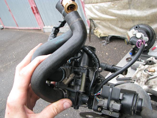 Откручиваем две гайки крепления блока к кузову и хомуты на шлангах.