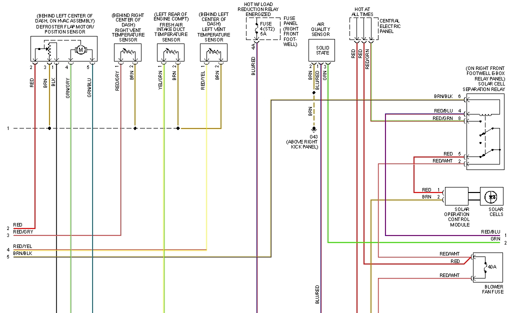 Короче Interior monitoring sensors control module тут не при чём. Отключил все провода идущие к вентилятору - нвшел разъем к котрому идет один из коричневых (земельных проводов) отключил - все стало работать, но тогда не работает люк солярий - это его минусовой провод. При включенном зажигании люк не работает, а не этот провод должно подаваться 12В, тогда при выключенном климате на вентиляторе на обоих концах по 12 В и разность потенциалов соответственно 0 и он не работает, а у меня на этом проводе 6В и соответственно вентилятол дует в пол силы. Между вентилятором и люком есть некое SOLAR OPERATION CONTROL MODULE - подозреваю, что этот пробитый диод именно там, а где этот девайс - опять не знаю