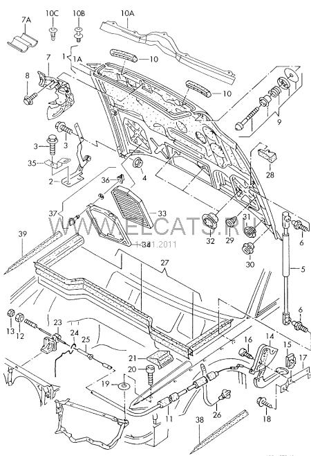 Трос проходит над левой фарой, и на стыке телевизора стоит первая защёлка, пропускаем трос в неё. Далее снимаем воздухозаборник воздушного фильтра и крепим сердечник троса к второй защёлке. Ставим ручку открытия капота в положение "закрыто" и регулируем натяжение сердечника троса между защёлками. Ставим на место воздухозаборник. Перед закрытием капота необходимо обязательно убедтиься в том, что при положении ручки капота "открыто", защёлки сжимаются т.е. открывают.