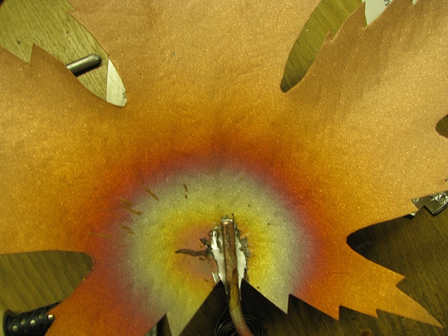 Листья после прогрева окислились и потемнели. Пескострую цветные места заново. Кстати, нужен ваш совет, оставить листья в пескоструенном виде, покрыть их лаком или искуственно состарить, чтобы они приобрели коричневато -зеленый цвет? Изначально предполагался именно 2-й вариант. На сегодня припаян один лист, завтра буду думать с флюсом для меди, нынешний плохо облуживает.