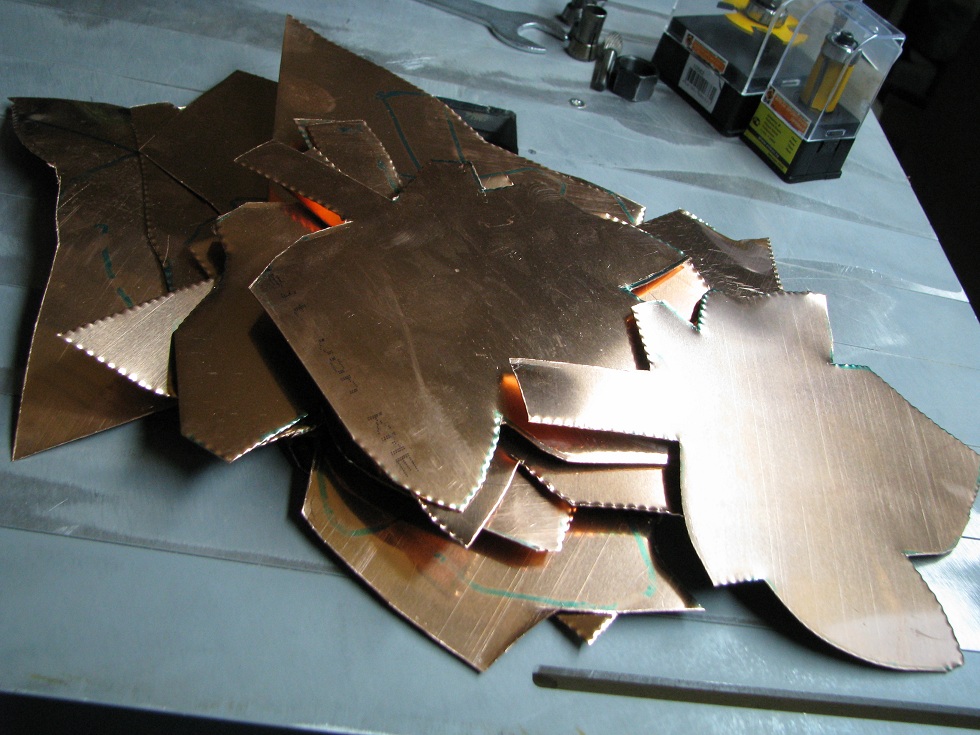 И так, начинаю посадку. В интернете нахожу картинку с кленовым листом, распечатываю на принтере в разном масштабе, примерно соответствующему имеющимся кусочкам металла. Приклеиваю бумагу на металл. Ножницами вырезаю по контуру. Долгая процедура требующая терпения. Каждые 30 минут – рождается лист. Листья еще имеют не презентабельный вид и заставляют немного усомниться в правильности выбора способа проведения ближайшего времени.