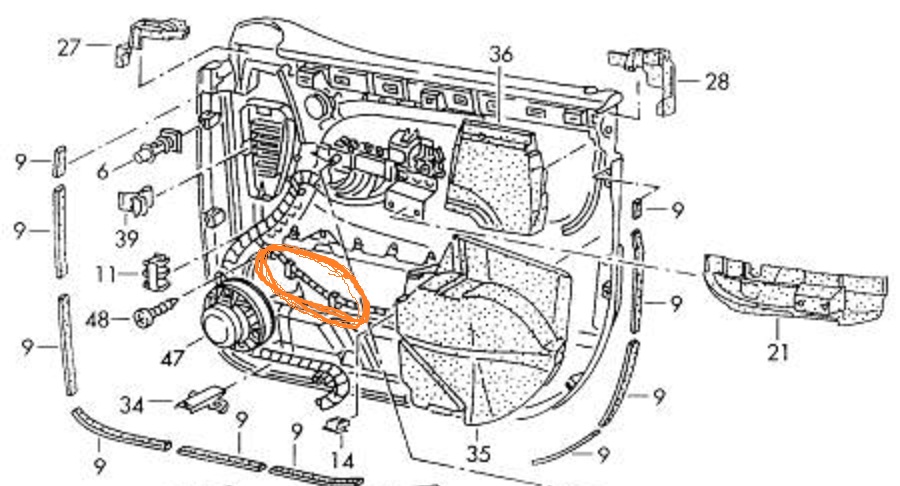 Подскажите номер металлической скобы, для фиксации жгутов проводки с обратной стороны дверной обшивки (обведено на картинке)