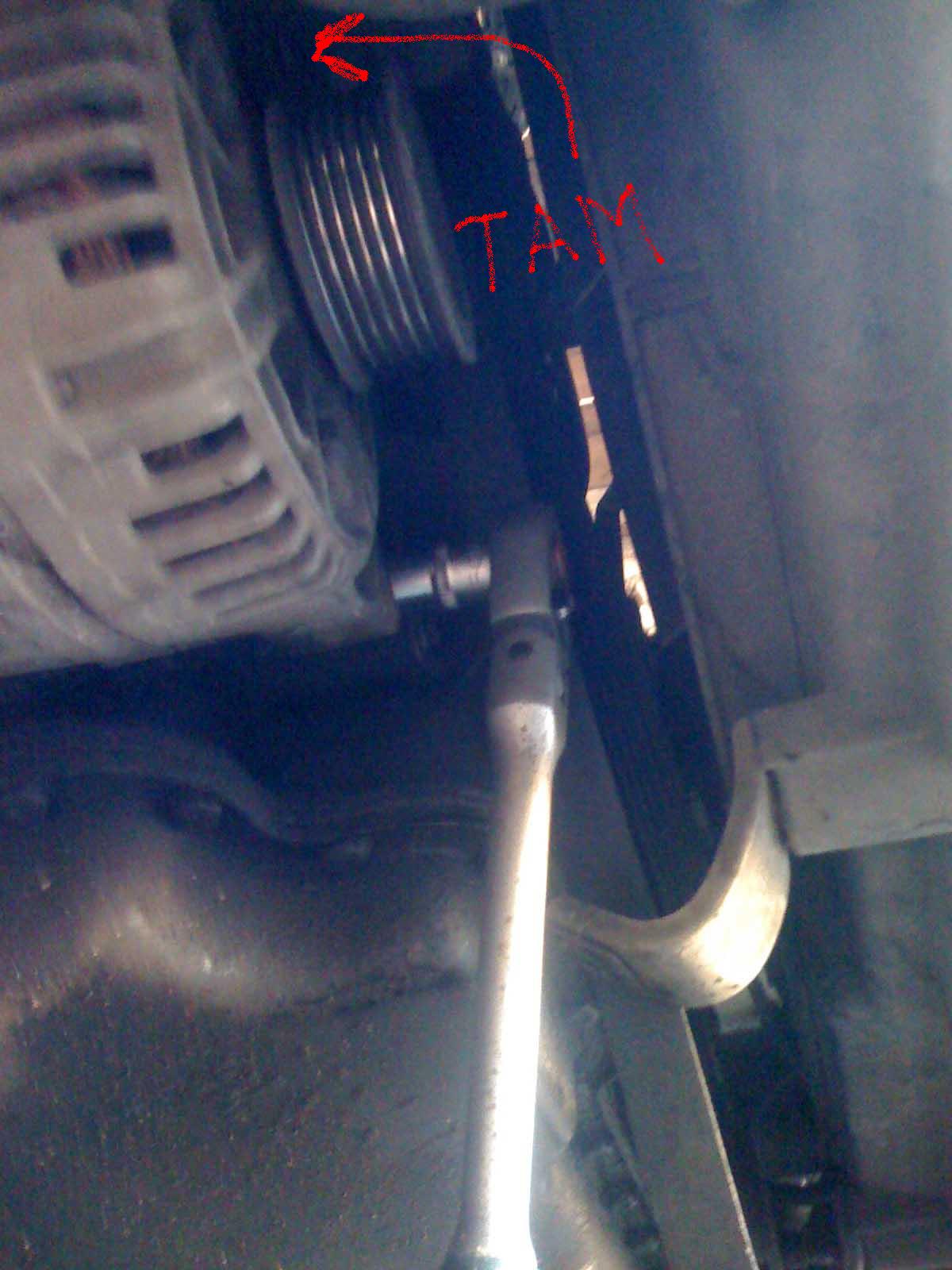 (Что бы обводной ремень особо не снимать и не запоминать как он стоит , нажимаем на натяжной ролик и фиксируем его в этом положении например деревяной рукояткой молотка, ремень ослаблен и легко снимается со шкива генератора ,после установки гены на место натягиваем ремень на шкив и вытаскиваем фиксирующий натяжитель молоток и ремень на месте без лишних тело движений и усилий)