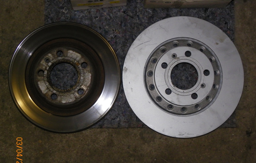 Сначала все как обычно, откручиваем колесные болты, домкратим авто, скидываем колесный диск, вынимаем колодки (Еще когда получил новые колодки, обратил внимание на странный золотистый цвет самого ферродо, для наглядности даже хотел сделать фото двух новых колодок от обычных тормозов и от бронированных, но в тот день кроме моих старых ничего под рукой больше не было. Разница в цвете заметна.), вытаскиваем тормозной диск и откручиваем старую скобу. У меня все открутилось на ура, бывает, что болты на скобах сильно захрясают, но мне повезло.