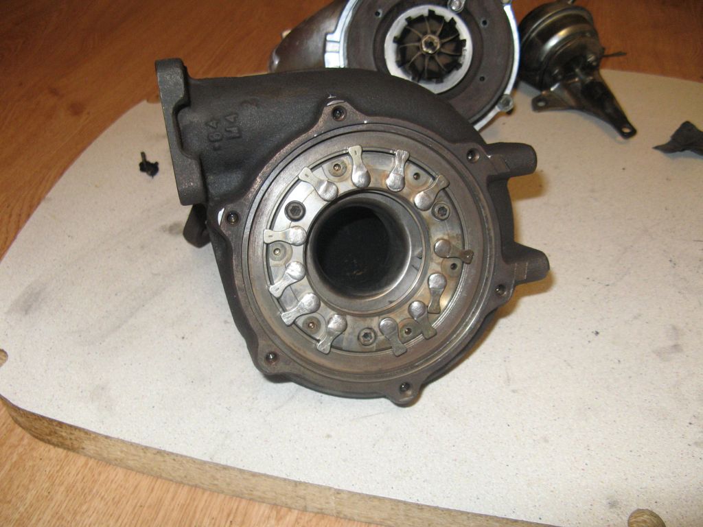 Так вот, почитав умных книжек и полазив на форумах, пришел к такому выводу: пора чистить турбину. Отложения сажи во время сильного нагрева турбины не дают свободно перемещаться регулируемым лопаткам. И получается зависание их в какой-то период и на какое-то время.. Отсюда наша беда. Как снимать, я думаю, тут не стоит говорить, фото отчет на форуме есть (замена фильтра картерных газов). А как выглядит процедура очистки можно посмотреть на фото.