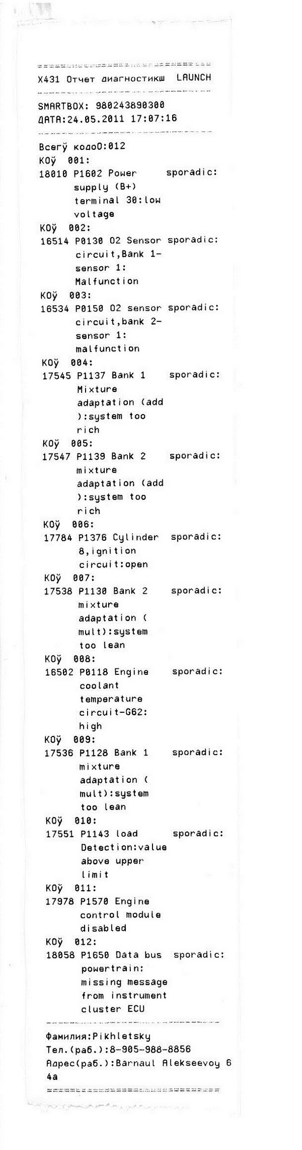 и после катов (соответственно поменяны). Ошибок по блокировке двигателя он не увидел, сказал, что это возможно из за снятие клеммы......Помогите грамотно расшифровать ошибки и составить перечень запчастей необходимых к замене для устранения этих ошибок.