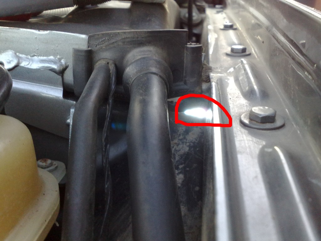 Оказалось, что пластиковый подкрылок неплотно прилегает к кузову в верхней своей части, и грязь летит прямо из-под колеса в подкапотное пространство. На фото видно только одну щель, чтобы добраться до второй, которая находится ближе к двигателю, надо снять малый пластиковый кожух.