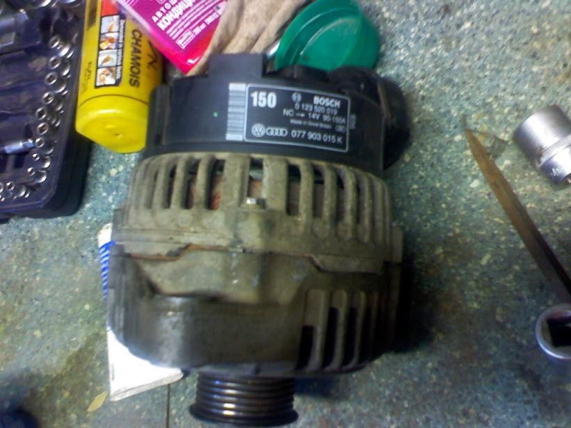 Имеем автомобиль Audi A8 4.2 AQF, И зашумевший генератор 150А.Снимаем генератор с машины и на стол)).Разборка осуществляется с задней части генератора. Откручиваем три саморезика, далее снимаем пластиковую крышку (она на защелках, снимается легко).Далее откручиваем реле-регулятор (см. фото).Затем нужно располовинить корпус, откручиваем болты 4 шт. (см. фото).Далее разъединяем его на две части, но просто руками он не поддается, нужно поддевать по кругу мощной плоской отверткой. Разъединив корпус, приступаем к снятию шкива. Откручиваем гайку, внутри вала сделан паз под звездочку и при помощи ключа и трещотки со звездочкой освобождаем узника. Далее снимаем шкив с вала (см. фото), я использовал съемник, который можно легко купить в магазине инструмента. И так шкив снят, приступаем к снятию корпуса с подшипника, для этого откручиваем 4 болта из корпуса (см. фото), затем, при помощи второго вида съемника снимаем корпус с подшипника. В корпусе формовка под подшипник. Т.е подшипник одет на вал и еще запрессован в корпус))Вот такая петрушка. Так, сняли корпус, и приступаем к снятию подшипника. Одеваем съемник и снимаем подшипник с вала (см. фото). Для того, что бы не повредить резьбу и шлицы под звездочку на валу генератора я использовал прокладку из обычного ключа. Сняли подшипник и перевернули другой стороной для снятия второго. Процесс одинаков (см. фото).И так все снято и готово к инсталляции новых з/ч. Подшипники фирмы NTN стояли в оригинале, такие же я и поставил. Задний подшипник всем известен как 6203 (его номер по Бошу 1 120 905 525)