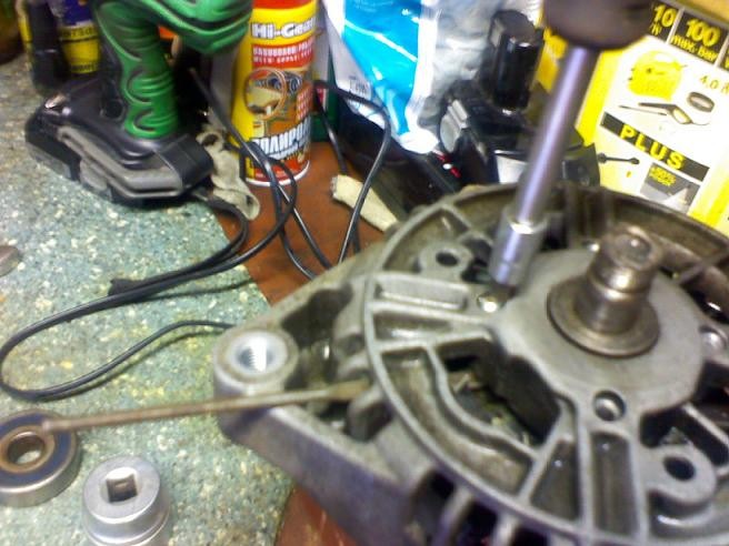 Передний подшипник размером 17х62x21 номер (Бош 1 120 905 531).Реле регулятор с номером (Бош 1 197 311 511).Начинаем запрессовывать подшипники на место. В качестве оправки я использовал длинную головку из набора ключей, очень хорошо подошла. Запрессован передний подшипник (см. фото), далее запрессовываем шайбу (см. фото). Потом одеваем корпус на подшипник, так же оправкой (см. фото). Переворачиваем генератор и прессуем задний подшипник (см. фото), продолжаем сборку, одеваем вал (см. фото), и закручиваем его. Окончательная сборка происходит как и разборка. Не забываем смазать все болты и гайки смазкой. По фоткам думаю, понятно получилось. На всякий случай номер генератора (см. фото).В итоге все крутится беззвучно.