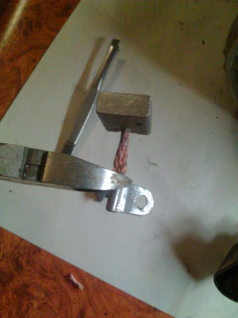 Сняв электродвигатель, вынимаем щетки, две защелкнутые блестящие пластинки, и смотрим на то что осталось: Поскольку не осталось почти ничего, первая мысль, бежать в магазин, покупать Щетки большего размера, обтачивать, ставить, припаивать выводы и радоватся жизни. Однако объездив все окрестные магазины подходящих щеток не нашел. Взвесив все за и против, приняв в расчет следующее: