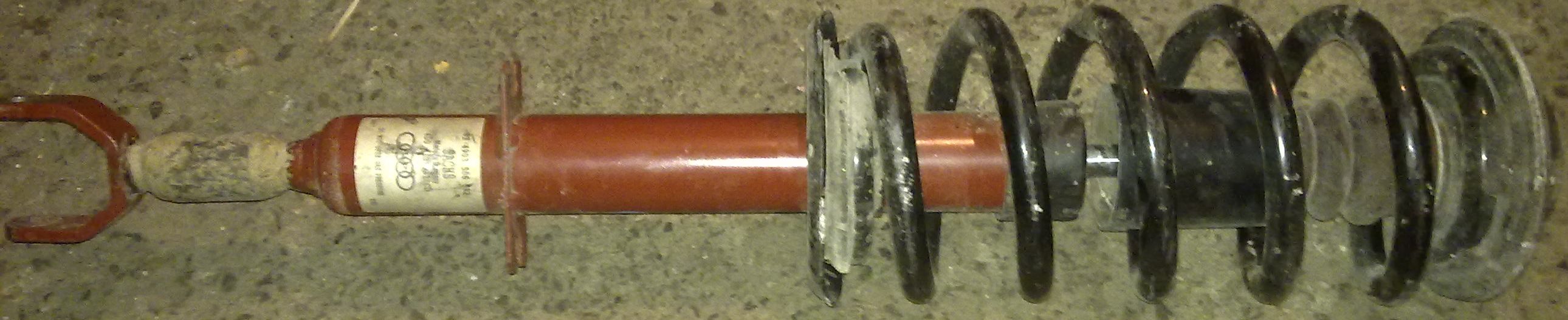 Родные амортизаторы- SACHS 4D0413031 CD , красного цвета . У меня просьба кому не трудно , замерьте расстояние указанное на фото , буду очень благодарен, оно мне необходимо , чтобы определится ставить родные стойки на авто обратно или нет, а может кто знает и без замеров размер таких амортизаторов. Пружины с маркировкой четыре серебристых точек- обозначающих жесткость.