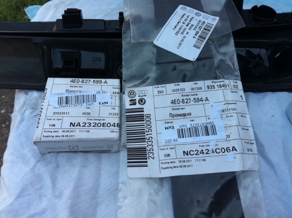 По кузовным деталям понадобятся накладка ручки багажника 4E0 827 576 F GRU, клавиша электрозамка 4E0 827 565 D, прокладки 4E0 827 594 A, 4E0 827 599 A.