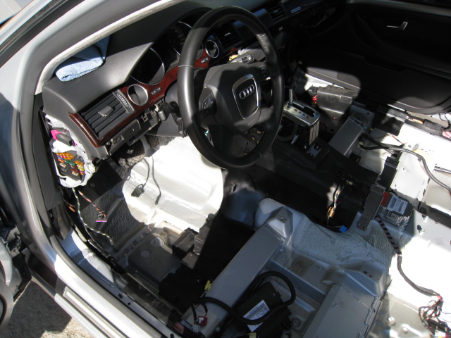 1.Был разобран салон!Удалены сиденья передние и подушка заднего сидения!Было снято родное ковровое покрытие и центральная консоль!Также удалены накладки порогов,нижние части средних стоек,бардачек,накладка панели со стороны водителя(я ее называю ее подторпедником)!После этого любуемся представленной картиной!