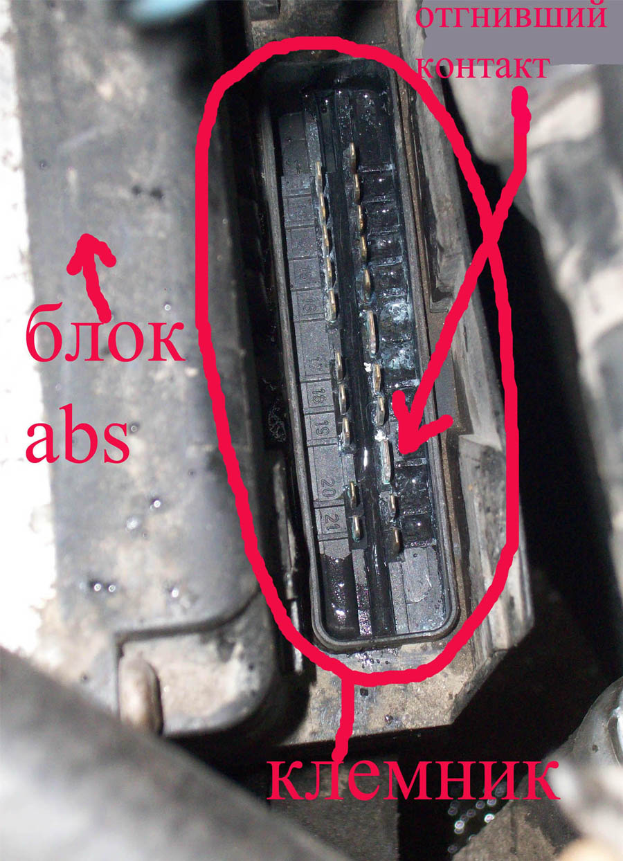 У меня была аналогичная проблема, если задаться поиском, то можно найти. Коротко повторюсь - необходимо сделать два пропила ножовочным полотном напротив сгнивших контактов и отвёрткой выбить выпиленный кусок колодки. Обнаружатся корни сгнивших контактов. Изготавливаем из листовой ( толщиной примерно 1мм ) латуни или меди новые контакты и припаиваем их к корням сгнивших. Выпиленный кусок замазываем герметиком ( желательно чёрным для эстетичности ). Самое главное - это процесс пайки: "масса" должна быть отключена, при непосредственной пайке, паяльник должен быть отключен от сети питания, если не умеете паять, то лучше и не браться а найти того, кто умеет. С самостоятельно отремонтированным блоком ABS, уже езжу три года, никаких проблем не возникало.
