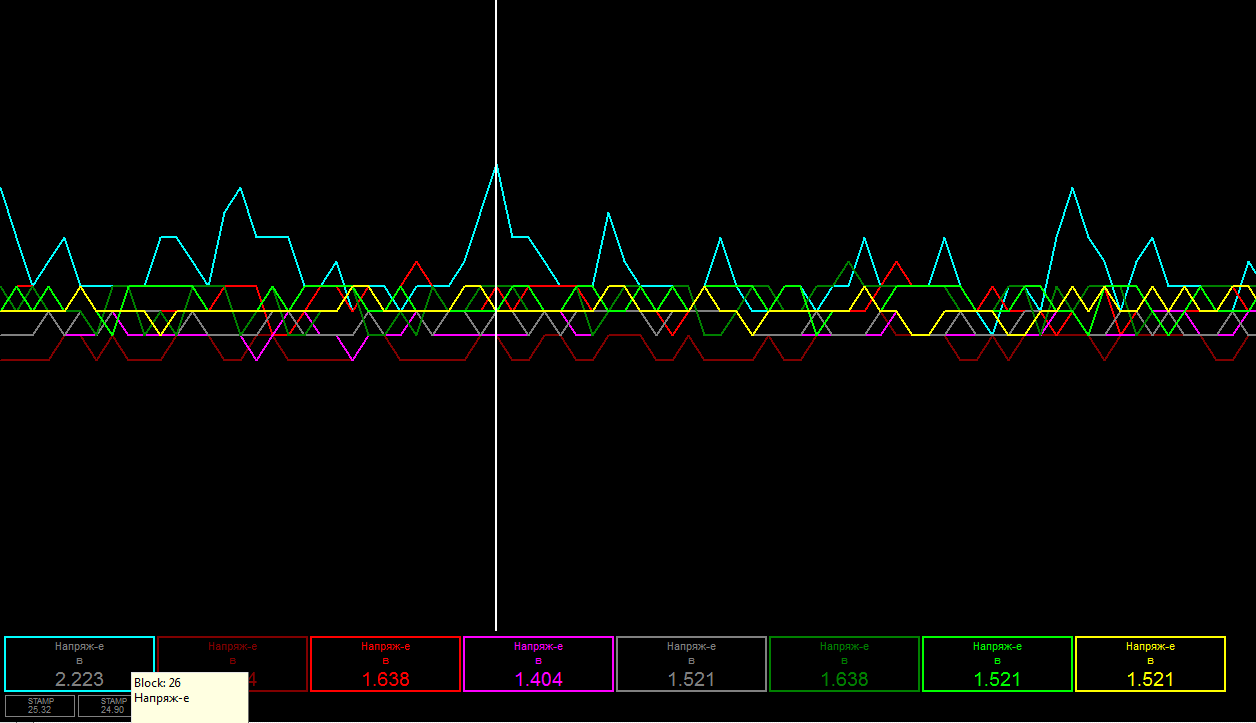 Сначала я считал данные и записал лог с холостого хода. Обращаем внимание, что напряжение по первому цилиндру скачет выше всех.В пиках достигая 2.2 в.Остальные цилиндры идут более равномерно.